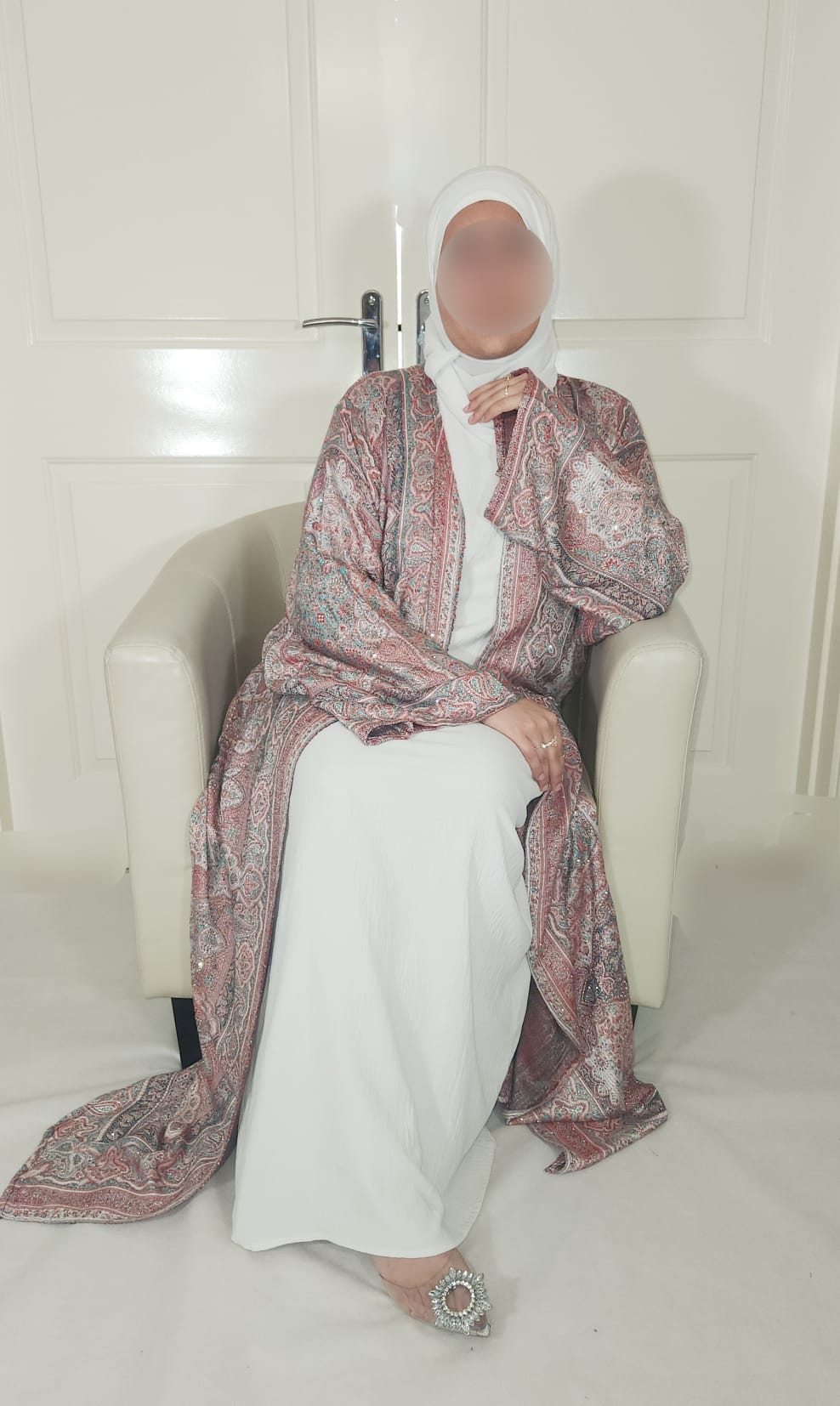 This pashmina abaya is adorned with delicate rhinestones that shimmer subtly with every movement.