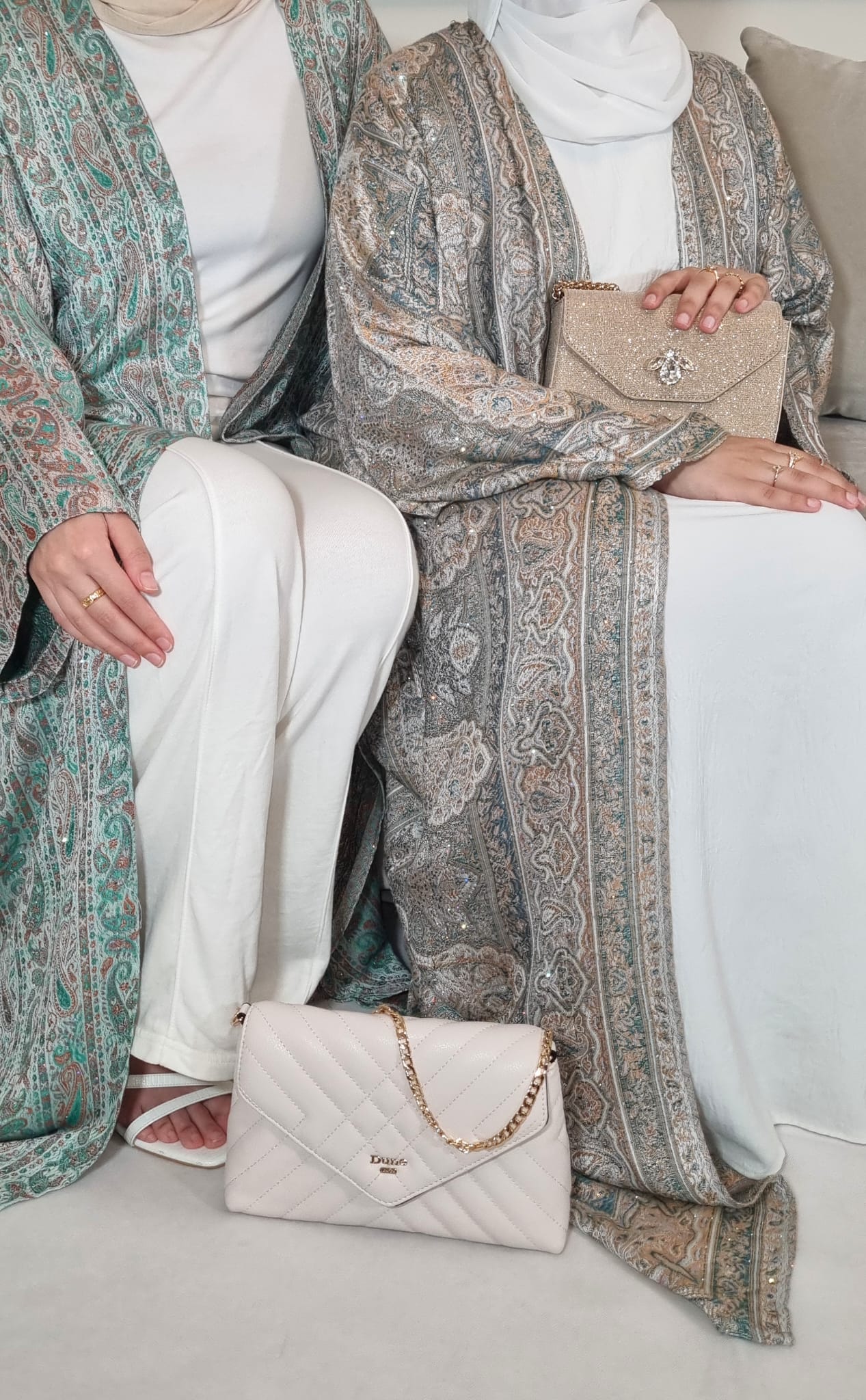 This pashmina abaya is adorned with delicate rhinestones that shimmer subtly with every movement.